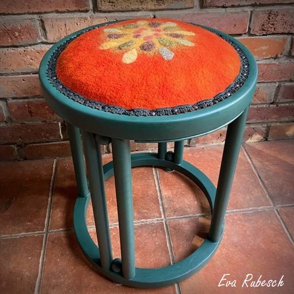 Flohmarktstühlchen oder ein Hocker von Oma schreien oft nach einem neuen Bezug. Bei Bea lernst du, wie du ohne Polstererwissen dem „alten Schwamm” eine PASSENDE neue Verkleidung filzt und anziehst.